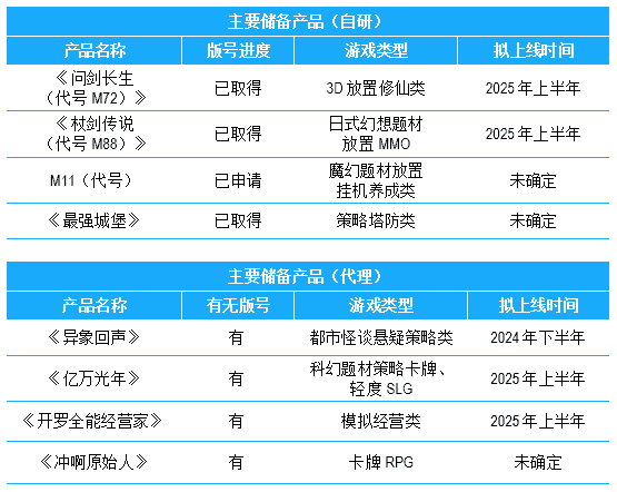 公司儲備多款新品,,,期待為玩家解鎖更多新鮮體驗,,,,部分產(chǎn)品如下表所示:::
